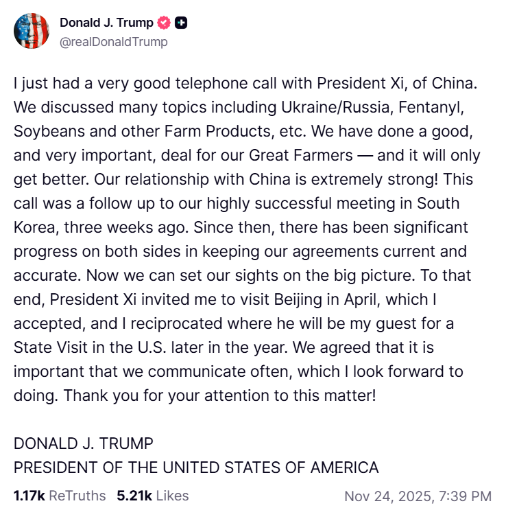 Apelul telefonic a avut loc după ce cei doi lideri s-au întâlnit în Coreea de Sud la sfârșitul lunii octombrie, prima lor întâlnire față în față din 2019, în timpul căreia cele două țări au ajuns la un armistițiu tarifar de un an și la o pauză a controlului exporturilor.