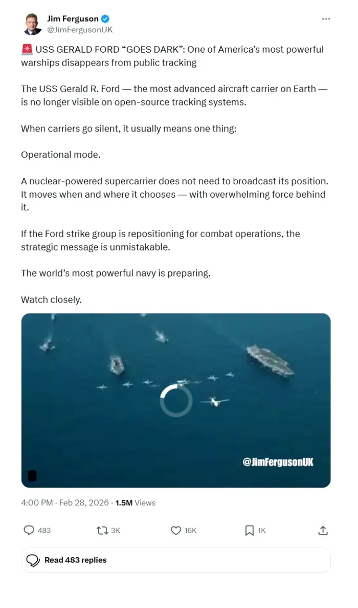 „Portavionul USS Gerald Ford a devenit invizibil: unul dintre cele mai puternice vase a dispărut de pe radar. Când portavioanele devin invizibile, înseamnă un singur lucru: Modul Operațional. Un portavion alimentat nuclear nu trebuie să-și dezvăluie poziția. Se poate duce oriunde și oricând unde alege, cu o forță considerabilă la bord. Cel mai puternic vas se pregătește”, a spus acesta.