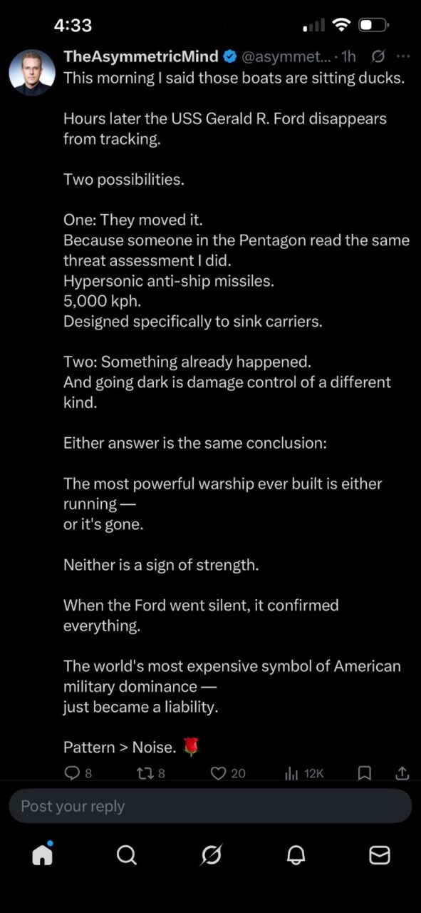 @TheAsymmetricalMind și mulți alți internauți au presupus că cel mai avansat portavion din lume ar fi fost lovit de rachete hipersonice anti-navă.