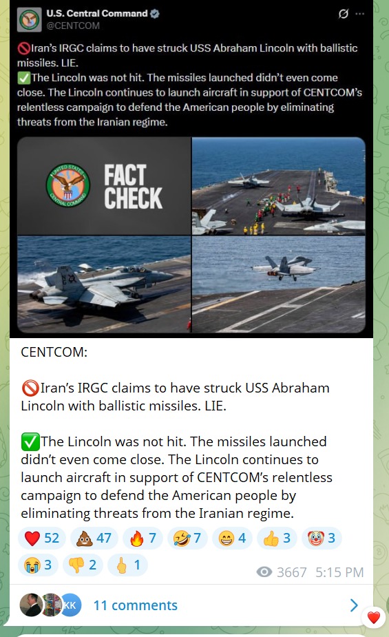 Comandamentul Central al SUA neagă informația că portavionul USS Abraham Lincoln ar fi fost lovit de vreo rachetă balistică iraniană. A adăugat că portavionul continuă să desfășoare campania pentru apărarea poporului american prin eliminarea amenințărilor din partea regimului iranian.