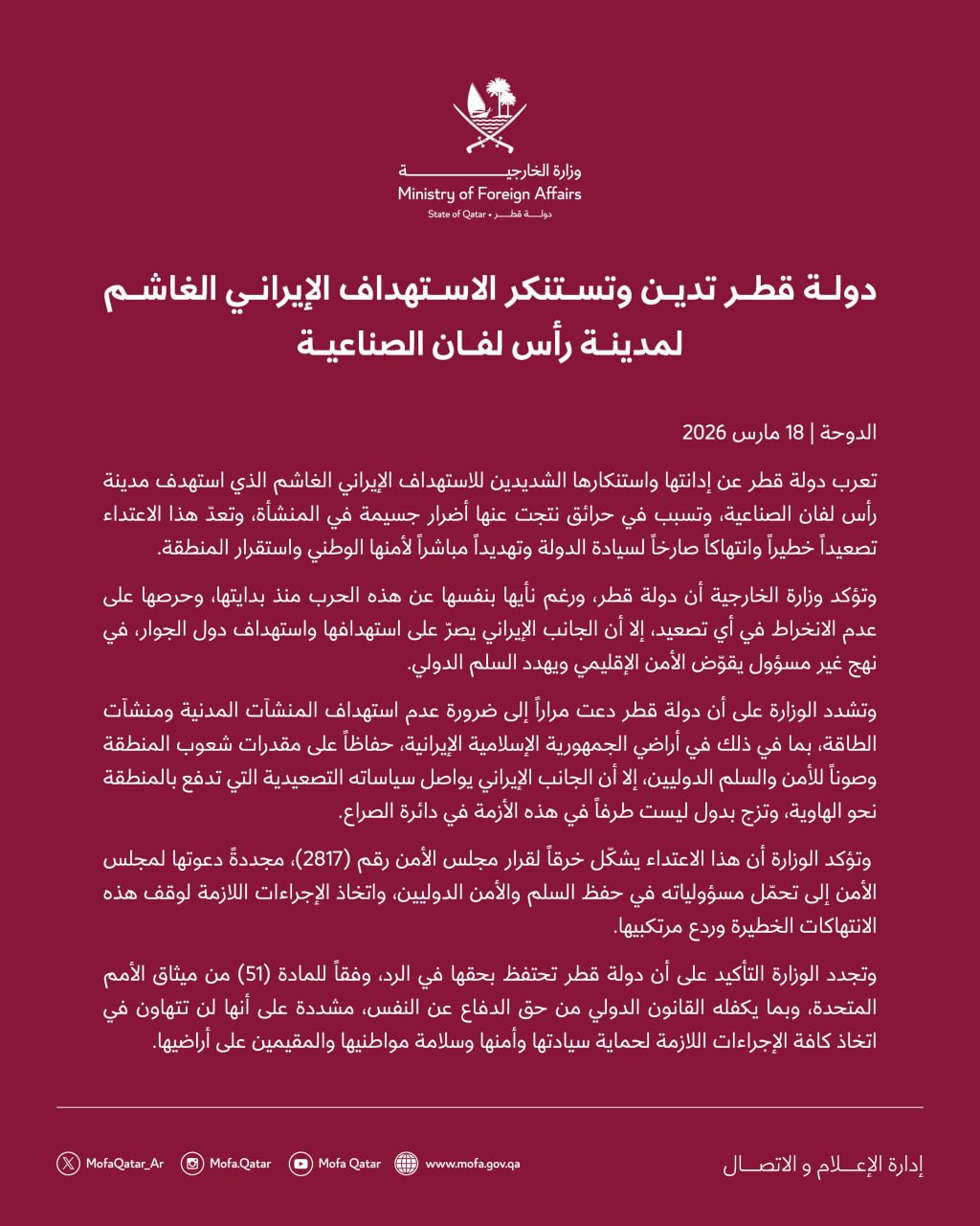 Echipajele de urgență au intervenit rapid. Nu au fost raportate victime. Qatarul a denunțat atacul iranian și a considerat acest act drept o escaladare, o amenințare directă la securitatea regională și o încălcare a suveranității.