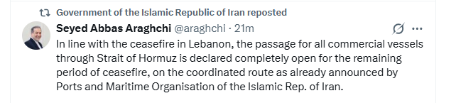 Abbas Araghchi a subliniat că măsura este „în conformitate cu armistițiul din Liban”, întrucât Iranul a condiționat anterior redeschiderea completă a Strâmtorii Ormuz de încetarea ostilităților dintre Israel și Hezbollah.