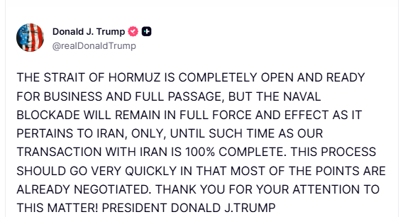 Anunțul ministrului de externe iranian a fost urmat de cel al lui Donald Trump, care a scris pe Truth Social că tranzitul prin Strâmtoarea Ormuz este reluat, dar blocada americană rămâne în continuare în vigoare.