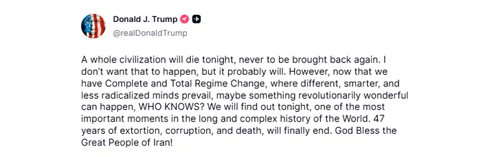 „O întreagă civilizație va muri în seara asta, și nu va mai fi readusă niciodată la viață. Nu vreau să se întâmple asta, dar probabil că se va întâmpla. Totuși, acum că avem o Schimbare Completă și Totală a Regimului, unde predomină minți diferite, mai inteligente și mai puțin radicalizate, poate că se poate întâmpla ceva revoluționar minunat, CINE ȘTIE? Vom afla în seara asta, unul dintre cele mai importante momente din lunga și complexa istorie a lumii. 47 de ani de extorcare, corupție și moarte se vor încheia în sfârșit. Dumnezeu să binecuvânteze Marele Popor al Iranului!”, a scris Donald Trump marți pe Truth Social.