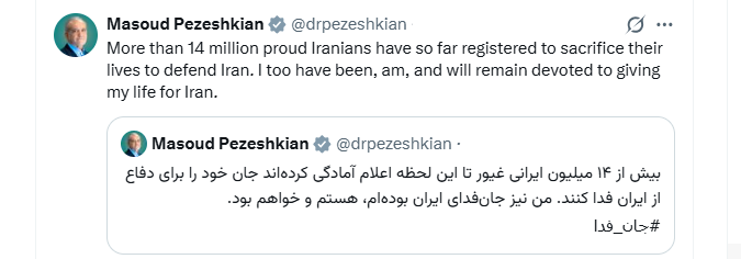 „Peste 14 milioane de iranieni mândri s-au înregistrat până acum pentru a-și sacrifica viața pentru a apăra Iranul”, a scris Pezeshkian într-o postare pe platforma de socializare X. „Și eu am fost, sunt și voi rămâne devotat să-mi dau viața pentru Iran.”