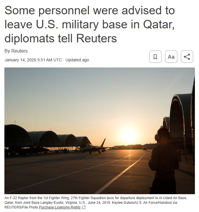 Agenția de știri Reuters relatează că, potrivit unor surse, unii membri ai personalului au fost sfătuiți să părăsească baza aeriană americană al-Udeid din Qatar până miercuri seara.