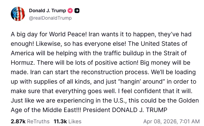„Iranul s-a săturat de război.”, a anunțat Președintele american, care a calificat ziua de marți, 7 aprilie 2026, drept o zi „importantă” pentru pacea mondială.