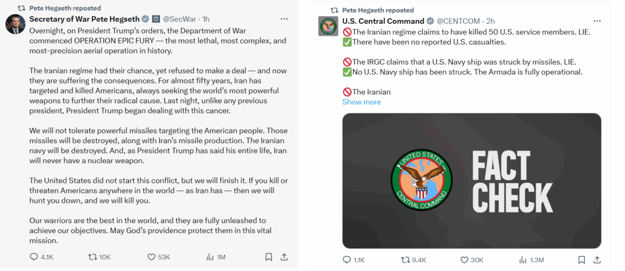 Pete Hegseth a repostat și comunicatul Comandamentului Central al SUA privind știrile false distribuite pe rețelele de socializare despre operațiunile militare de sâmbătă.