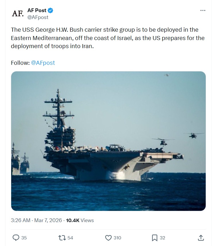 SUA vor staționa un nou grup naval de atac condus de portavionul USS George H.W. Bush în estul Mării Mediterane, lângă coasta Israelului, și să trimită trupe în Iran, potrivit AF Post.