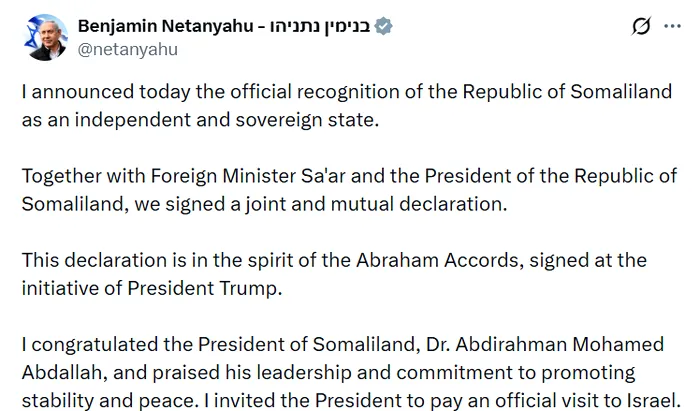 „Am anunțat astăzi recunoașterea oficială a Republicii Somaliland ca stat independent și suveran. Împreună cu ministrul de externe Sa’ar și cu președintele Republicii Somaliland, am semnat o declarație comună și reciprocă. Această declarație este în spiritul Acordurilor Abraham, semnate la inițiativa președintelui Trump. L-am felicitat pe președintele Somalilandului, Dr. Abdirahman Mohamed Abdallah, și l-am lăudat pentru conducerea și angajamentul său față de promovarea stabilității și păcii. L-am invitat pe președinte să efectueze o vizită oficială în Israel”, a declarat premierul Benjamin Netanyahu pe X.