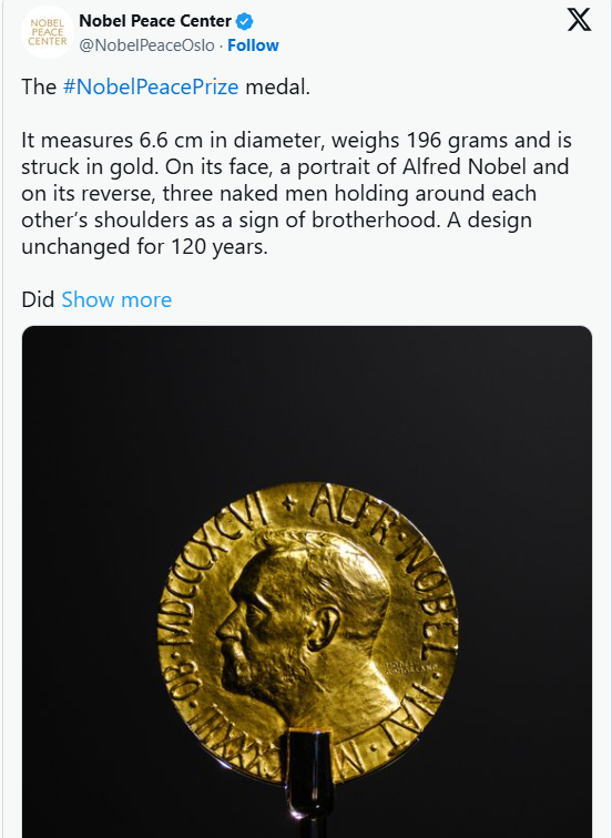Comitetul Nobel din Norvegia și Centrul Nobel pentru Pace au subliniat promt că, deși o medalie fizică poate fi transferată unei alte persoane și a fost, în mod tradițional, împrumutată sau licitată, la fel ca în cazul laureaților din trecut, precum Dmitri Muratov, titlul de laureat al Premiului Nobel pentru Pace nu poate fi revocat, partajat sau transferat odată acordat. O postare a Centrului Nobel pentru Pace de pe platforma de socializare X a menționat designul tradițional al medaliei și a reiterat faptul că Premiul Nobel rămâne legat permanent de câștigătorul inițial.