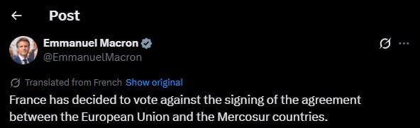 „Franța a decis să voteze împotriva semnării acordului între Uniunea Europeană și țările Mercosur”, a anunțat președintele francez Emmanuel Macron.