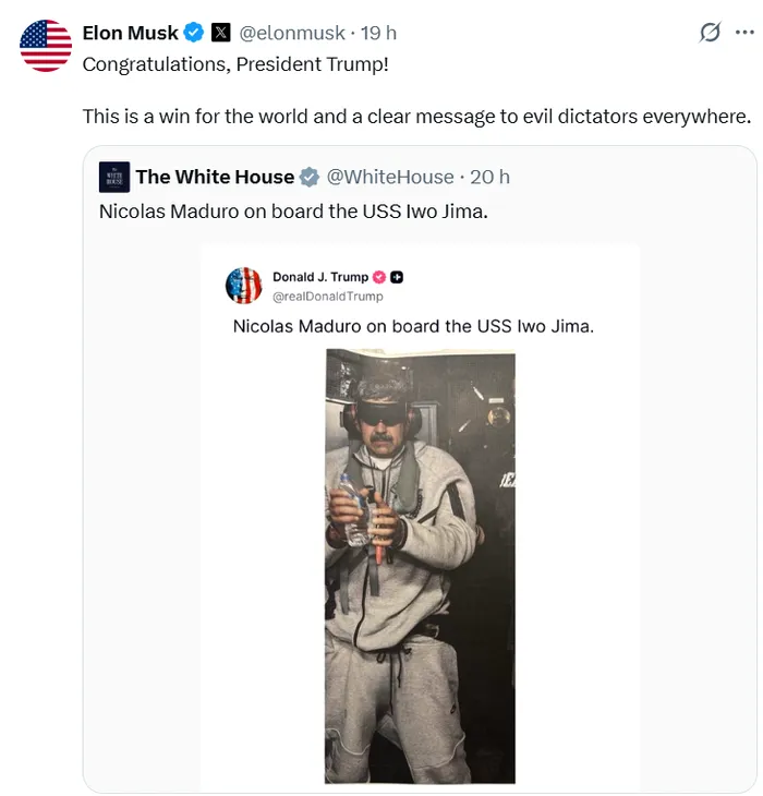 Directorul executiv al Tesla, Elon Musk, l-a felicitat public pe președintele american, Donald Trump, în urma evoluțiilor din Venezuela, care au dus la înlăturarea de la putere a președintelui Nicolas Maduro. Într-o postare distribuită pe platforma sa de socializare X, Musk a scris: „Felicitări președntelui Trump! Aceasta este o victorie pentru lumea întreagă și un mesaj clar pentru dictatorii malefici de pretutindeni.“