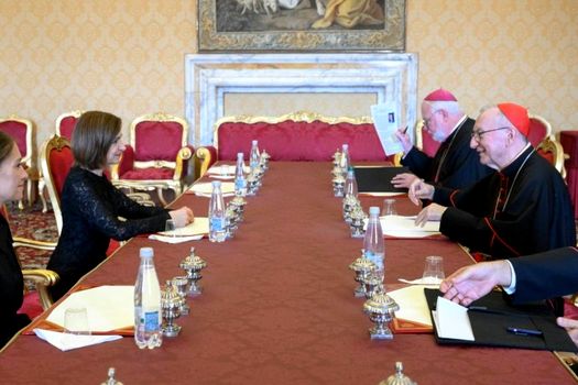 După întrevederea cu Suveranul Pontif, şefa statului moldovean a avut o întâlnire cu cardinalul secretar de stat Pietro Parolin şi cu arhiepiscopul Paul Richard Gallagher, secretar pentru Raporturile cu statele şi organizaţiile internaţionale.