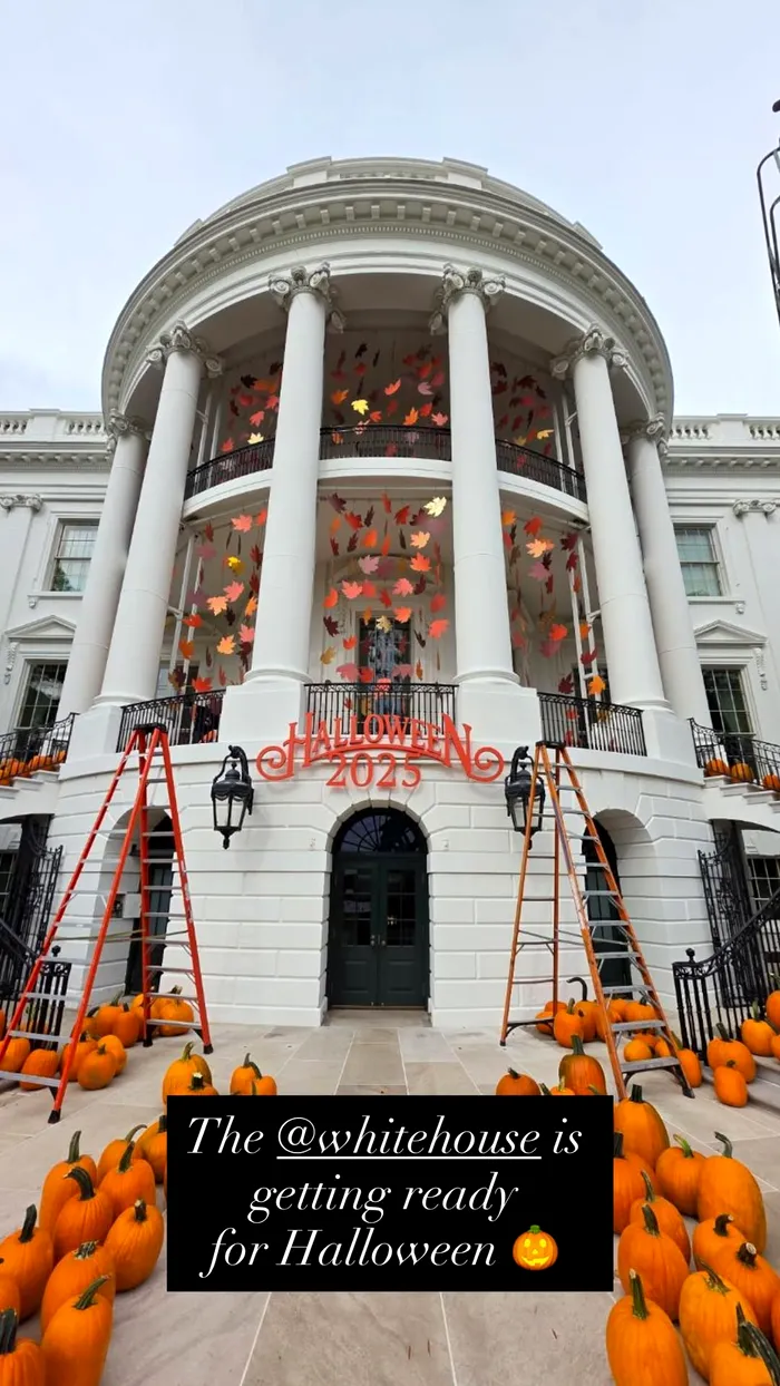 Într-o imagine publicată pe conturile Casei Albe, se poate vedea cum prticul Sudic al Casei Albe a fost deja umplut cu tradiționalii dovleci. O perdea de frunze a fost amplasată, de asemenea, printre coloanele înalte, iar semnul cu „Halloween 2025“ a fost și el așezat la baza lor. Două scări ale decoratorilor mai sunt vizibile în poză, semnă că acesta nu va fi nici pe departe rezultatul final.