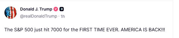 La câteva minute după apariția soției sale la Bursa de Valori, Donald Trump a scris pe Truth Social că „Indicele S&P 500 tocmai a atins 7000 pentru PRIMA DATĂ. AMEICA S-A ÎNTORS!!!”.