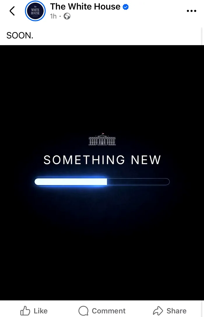 Casa Albă continuă epopeea mesajelor misterioase de pe social media și postează o imagine cu o bară de încărcare și textul „Something new”. Acest mesaj vine după alte câteva postări bizare din ultimele 24 de ore, printre care un videoclip cu picioarele unei femei sau imagini pixelate cu Donald Trump și JD Vance.