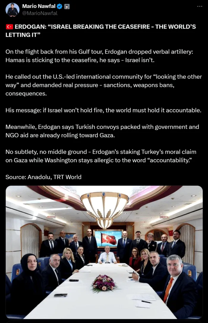 Ministrul a citat o postare a antreprenorului Mario Nawfal, potrivit căruia Erdogan acuza Israelul pentru încălcarea armistițiului mediat de SUA din Fâșia Gaza. La întoarcerea din călătoria sa din zona Golfului Persic, Erdogan a declarat că Hamas respectă armistițiul, iar Israelul îl încalcă.