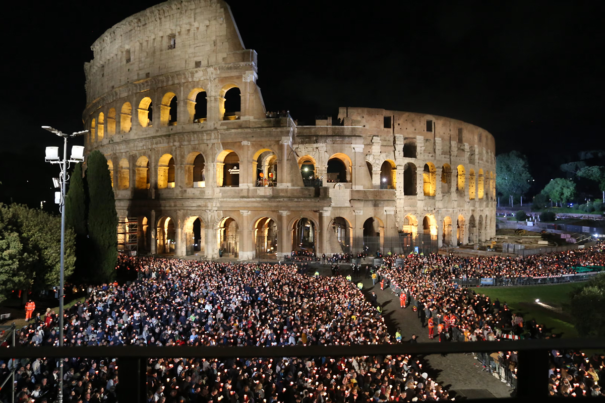 Într-o atmosferă solemnă, luminată de mii de lumânări, Papa a condus procesiunea prin ruinele vechiului edificiu roman, loc încărcat de istorie, unde numeroși creștini au fost martirizați în primele veacuri.