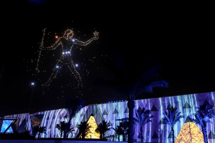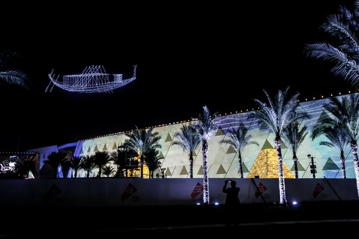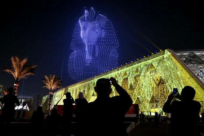 În seara inaugurării Marelui Muzeu Egiptean, trecătorii au putut admira nu doar artificii, ci și masca de aur a Faraonului Tutankhamon pe cerul nopții, alcătuită din formațiuni de drone aprinse. Mulți participanți la ceremonie au stat încremeniți, cu telefoanele scoase pentru a surprinde momentul de basm.