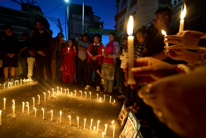 Membrii familiilor persoanelor ucise în timpul protestului din 8 septembrie participă la un priveghi la lumina lumânărilor în fața morgii Spitalului Universitar din Kathmandu.