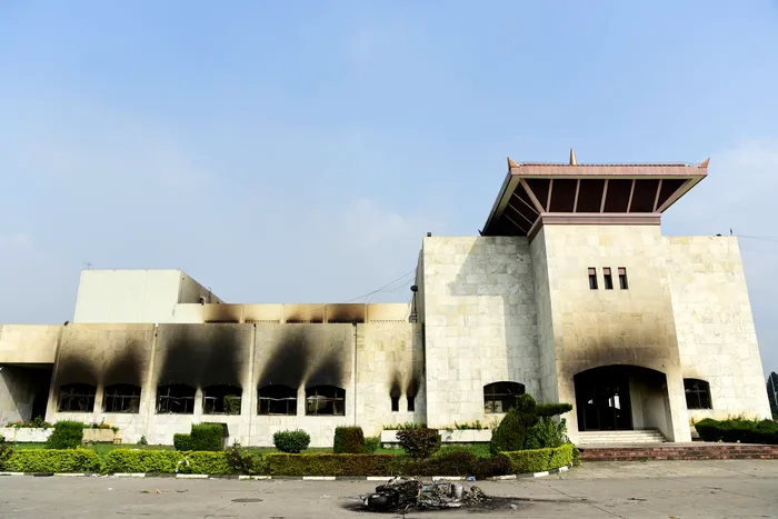 Clădirea Parlamentului Federal din Nepal, după ce a fost incendiată de protestatari în timpul demonstrațiilor violente din Kathmandu, Nepal.