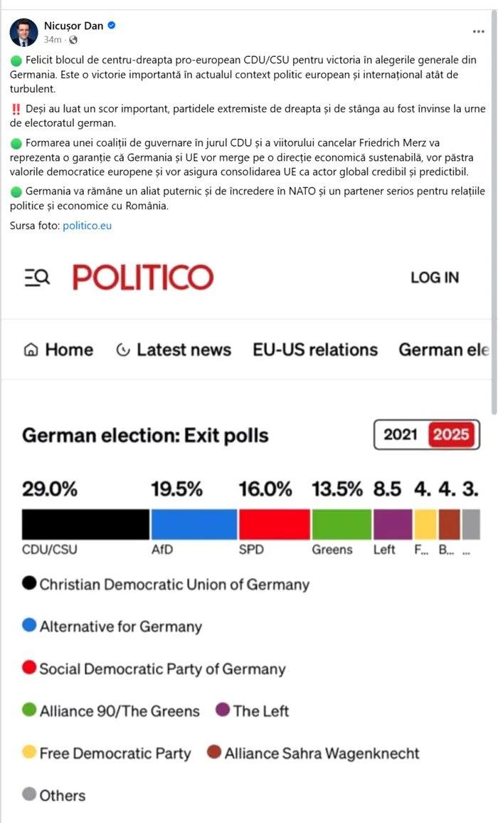 Primarul Bucureștiului a scris pe pagina sa de Facebook că viitorul cancelar Friedrich Merz, lidrul CDU, va reprezenta o garanție că Germania se va va menține pe un traseu democrat pro-european și va consolida Uniunea Europeană în poziția de actor global. Nicușor Dan speră că Germania va rămâne un aliat puternic în NATO și un partener economic al României.