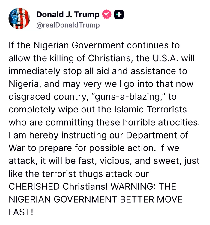 Anterior, Donald Trump a scris pe pagina de socializare Truth Social că oficialii de Abuja permit masacrul creștinilor, iar Statele Unite vor sista toate ajutoarele și asistența acordată Nigeriei. Mai mult, SUA se gândește la o intervenție militară pentru a distruge organizațiile teroriste din țară.