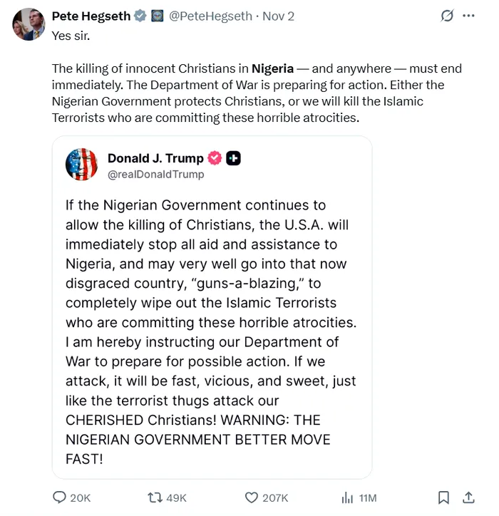 „Fie guvernul nigerian îi protejează pe creștini, fie îi vom ucide pe teroriștii islamici care comit aceste atrocități oribile”, a declarat Hegseth pe pagina de socializare X.