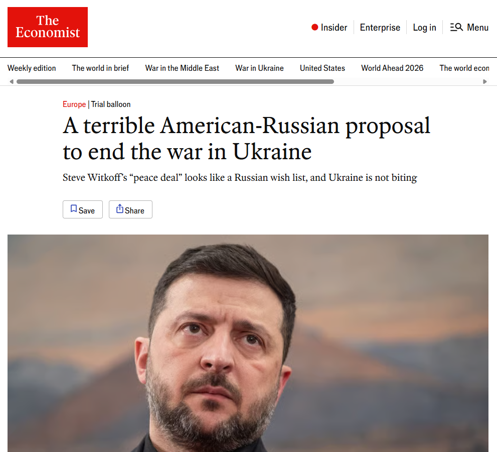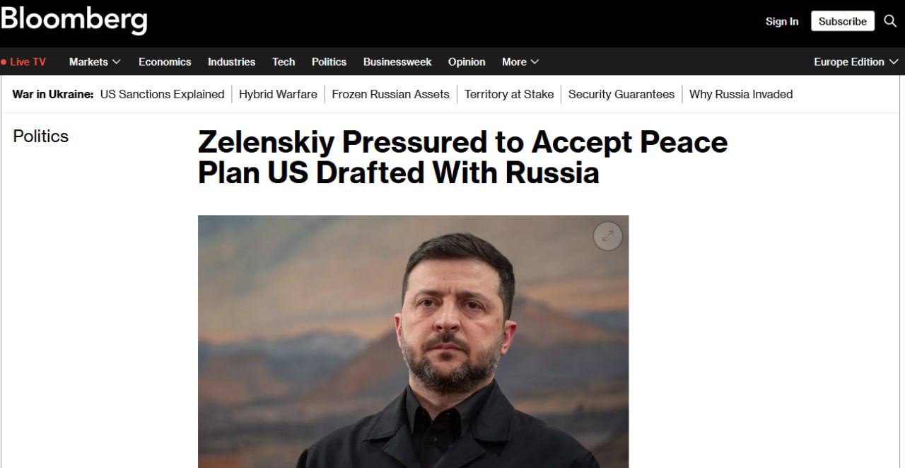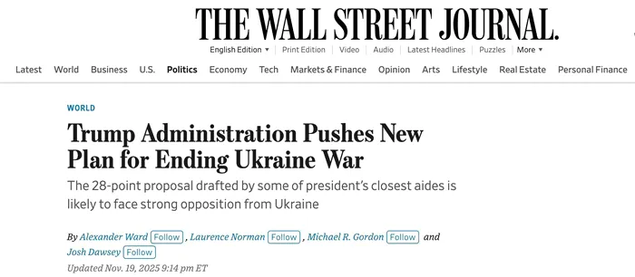 NBC News susține că Trump a aprobat un plan în 28 de puncte, la care au lucrat Whitkoff, J.D. Vance, Marco Rubio și Jared Kushner. Axios, FT și Reuters raportează că acesta prevede cedarea întregului Donbas către Rusia, înghețarea liniei frontului în regiunile Herson și Zaporijjea, reducerea armatei ucrainene la jumătate și o pauză în aderarea Ucrainei la NATO.