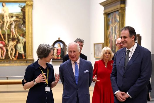 Regele și regina au fost întâmpinați cu mare fanfară la Galeria Națională. Charles era îmbrăcat într- un costum elegant bleumarin, cu o cravată cu modele de castel, pe când Camilla a purtat o rochie roșie aprinsă, conform Daily Mail.