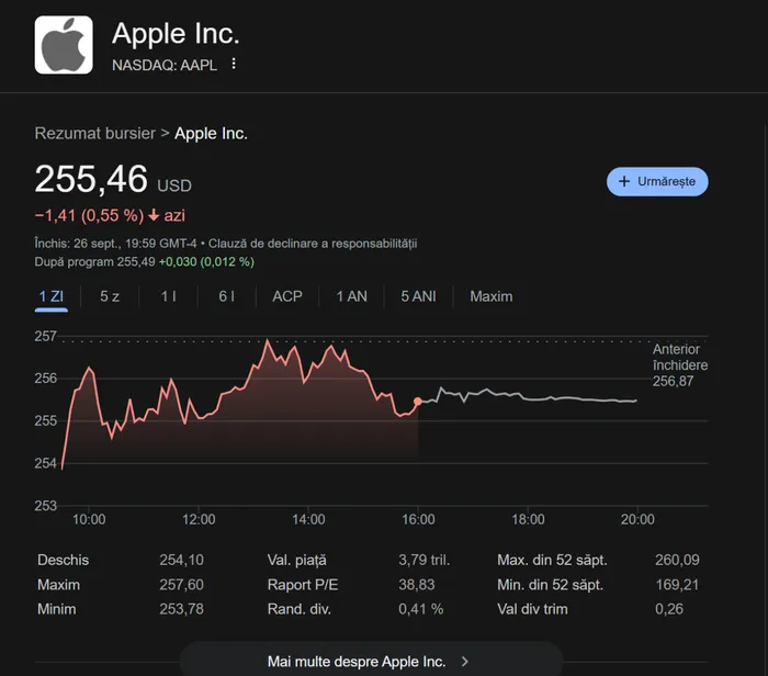 Acțiunile companiei Apple sunt în scădere, închizând săptămâna cu 255,46 de dolari, adică cu -0,55%, după ce tot mai mulți cumpărători de telefoane din seria iPhone 17 s-au plâns de calitatea acestora. Valul de reclamații a dus și la scăderea încrederii privind durabilitatea învelișului de aluminiu.