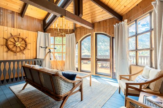 „Ahoi, aventurieri! Acostat pe un lac de munte liniștit, acesta va fi un refugiu pentru naufragiați, ideal pentru navigatorii îndrăzneți. Experimentați un amestec de legende maritime și confort modern.