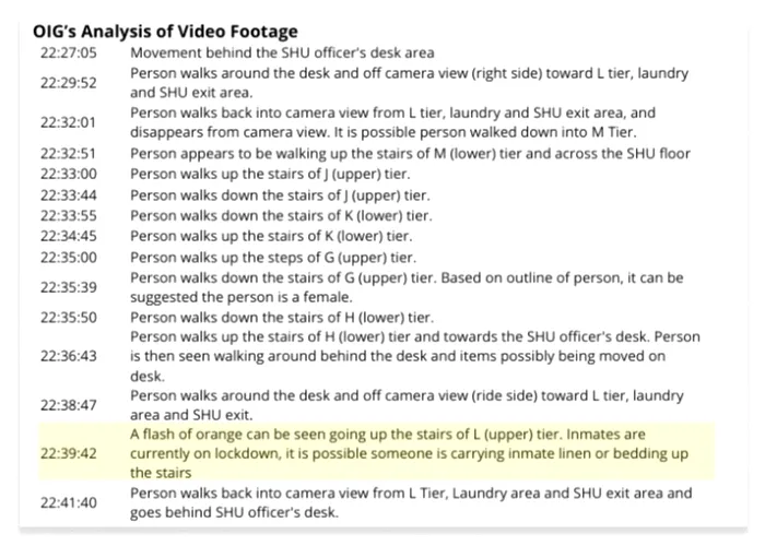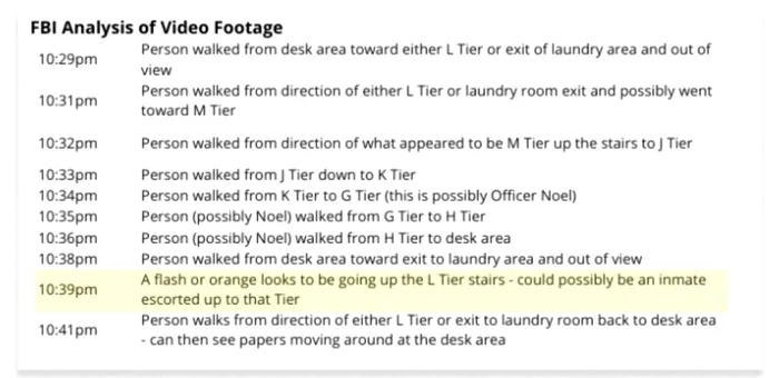 Noile documente publicate de Departamentul de Justiție din SUA conțin o înregistrare video din noaptea morții omului de afaceri. O  persoană neidentificată, îmbrăcată în ținută portocalie, a urcat pe scara care ducea chiar spre celula miliardarului. Ora înregistrării evenimentul: 22:39. Filmarea a fost realizată de Centrul de Corecție Metropolitan. Autoritățile au indicat că ar fi fost un deținut escortat când se urca la etaj, potrivit CBS News.