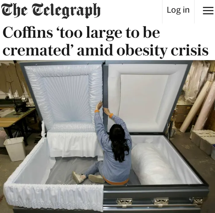 „Birourile funerare au avertizat că sicriele sunt acum prea mari pentru incinerare, ceea ce este un semn de majorare a cazurilor de obezitate în Regatul Unit. Administratorii birourilor funerare au declarat că, pe lângă comandarea de sicrie mai late și angajarea de purtători suplimentari, folosesc și cuptoare mai mari pentru incinerare.