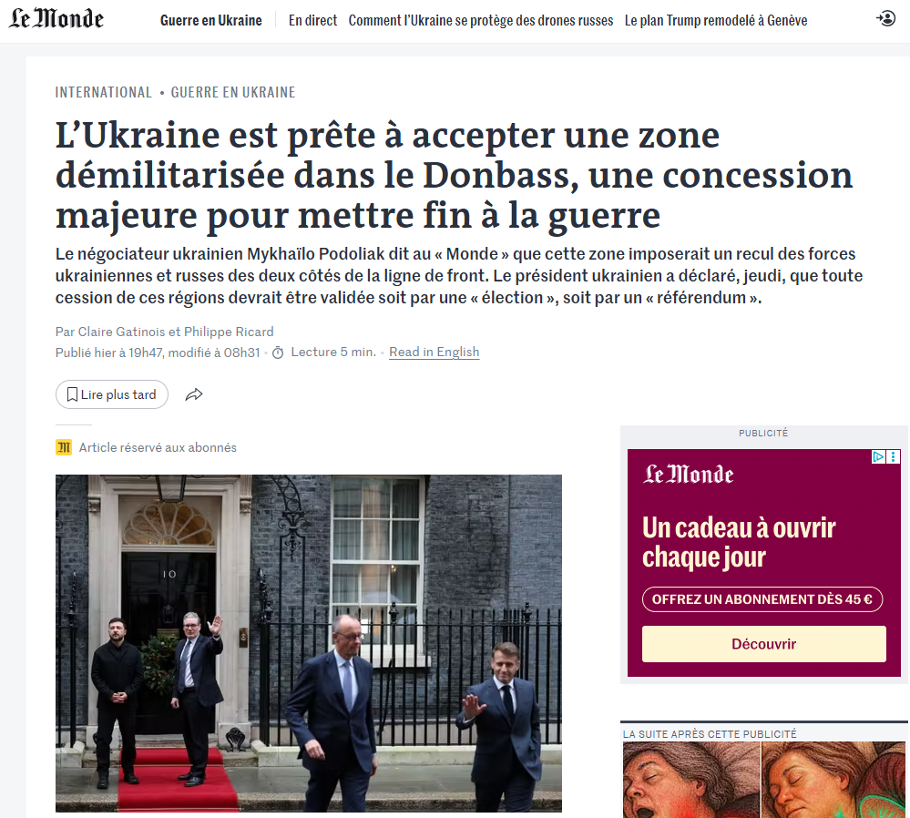 „Potrivit surselor noastre, Kievul cedează asupra unuia dintre punctele cheie ale negocierilor cu Statele Unite și Rusia, acceptând înființarea unei zone demilitarizate în Donbas. Această concesie, aprobată de Europa, își propune să pună capăt unui război de aproape patru ani.“, scriu jurnaliștii Le Monde.
