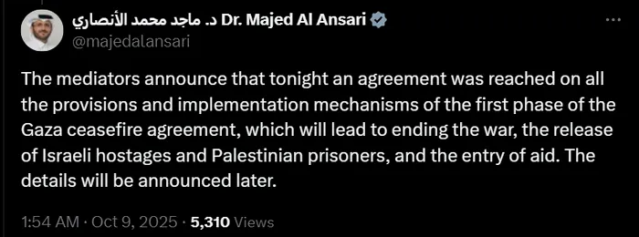 Purtătorul de cuvânt al ministerului de Externe din Qatar, Majed al-Ansari a scris pe platforma de socializare X că „mediatorii au anunțat că acordul a atins toate prevederile și mecanismele de implementare din prima fază a planului de încetare a focului din Fâșia Gaza, care va duce în cele din urmă la încheierea războiului, eliberarea tuturor prizonierilor israelieni și palestinieni, și sosirea ajutoarelor”.