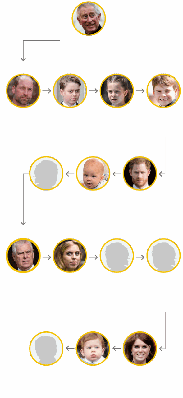 Iar al optulea la linia de succesiune este prințul decăzut Andrew, acuzat pentru legăturile sale cu infractorul sexual Jeffrey Epstein din SUA, care s-a sinucis în 2019 după ce a fost arestat din nou. Joi, Andrew a fost arestat și a petrecut o zi după gratii în arest pentru abuz în serviciu într-o funcție publică, fiind eliberat ieri seară. Poliția a anunțat că a fost eliberat sub anchetă.