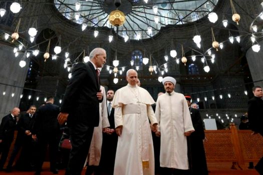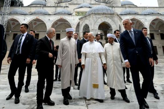 Papa fost întâmpinat la celebra Moschee de ministrul Turismului și Culturii, Mehmet Nuri Ersoy și, așa cum cere obiceiul islamic, potiful și-a dat jos pantofii înainte de a intra.