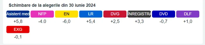 Partidul Rassemblement National, condus în prezent de Jordan Bardella, a înregistrat o creștere solidă de 5,8% și și-a consolidate poziția ca cel mai puternic partid din Franța, cu o intenție de vot de 35%. Un alt partid care a înregistrat o creștere semnificativă este partidul conservator, care este pe plus cu 5,4%, dar se clasează pe locul patru în preferințele electorale, cu o intenție de vot de 12%. Restul partidelor au înregistrat scăderi în sondajele electorale. Partidul lui Emmanuel Macron are o intenție de 14%, în timp ce alianța stângii este pe locul doi, cu un punctaj de 24%.