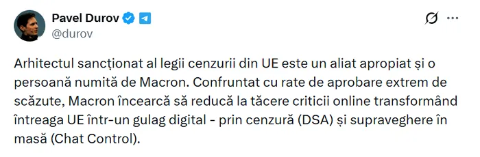 Într-o postare pe X, Pavel Durov susține că autoritățile franceze au încercat să folosească presiunea legală împotriva sa pentru a forța Telegram să cenzureze conținut politic. Durov l-a atacat pe Macron despre care susține că folosește legislația europeană, precum Digital Services Act, pentru a reduce al tăcere criticii online.