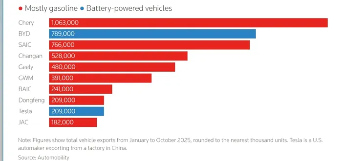 Cel mai mare exportator de mașini pe bază de combustibili fosili din China, între ianuarie și octombrie 2025, este compania Chery (1.063.000 vehicule) , iar cel mai mare exportator de mașini electrice este compania chinezească BYD (789.000 vehicule).