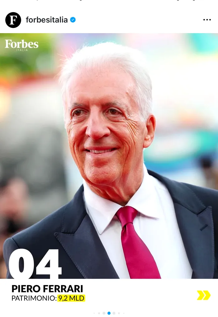 Antreprenorul Piero Ferrari, care deține peste 10% din pachetul de acțiuni al grupului automobilistic Ferrari, fondat de tatăl său Enzo, ocupă locul patru în clasament. Ferrari, căsătorit cu românca Romina Gingașu, fondatoarea Red Women Foundation, are un patrimoniu estimat la 9,2 miliarde de dolari (8,8 mld euro), în creștere de la 8,6 miliarde de dolari (8,23 mld euro).