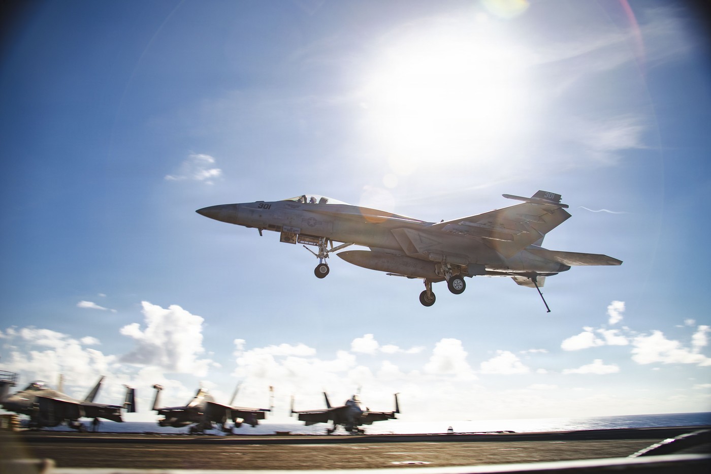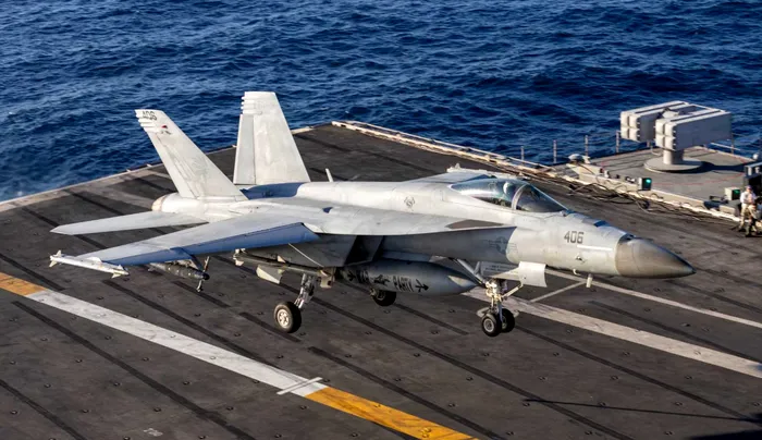 Un F/A-18E Super Hornet aterizează pe puntea de zbor a portavionului USS Gerald R. Ford | Foto – Departamentul de Război al SUA via Army Recognition