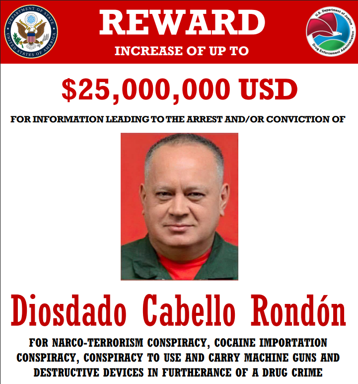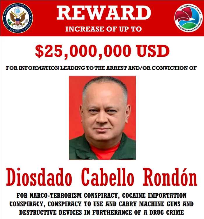 Statele Unite a pus o recompensă de 25 de milioane de dolari pentru informații care ar putea duce la prinderea lui Diosdado Cabello, un om cheie de la vârful de putere din Venezuela. Autoritățile din SUA îl acuză pe Cabello de trafic de droguri, spălare de bani și corupție.