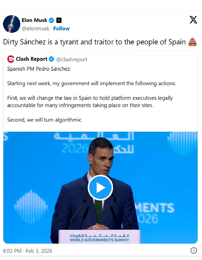 Elon Musk i-a criticat dur decizia premierului spaniol de a reglementa rețelele de socializare, inclusiv platforma X, și l-a catalogat drept „tiran” și „trădător”.