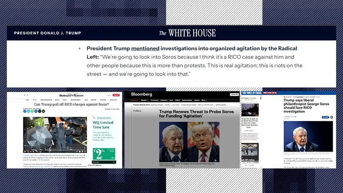 ”Îl vom cerceta pe Soros pentru că cred că avem un caz RICO împotriva lui și a altor oameni. Pentru că asta este mai mult decât proteste. Aceasta este agitație reală „.