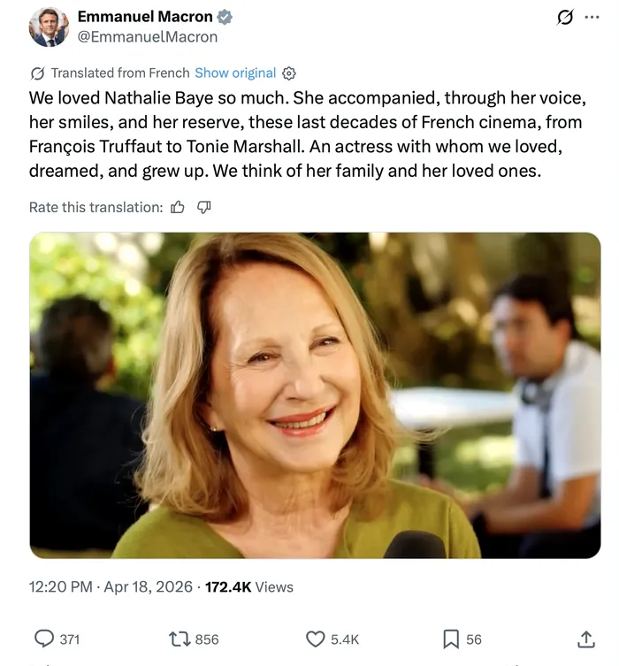 „Am iubit-o atât de mult pe Nathalie Baye. Ea a însoțit, prin vocea, zâmbetele și reținerea sa, aceste ultime decenii ale cinematografiei franceze, de la François Truffaut până la Tonie Marshall. O actriță alături de care am iubit, am visat și am crescut. Gândurile noastre se îndreaptă către familia și cei dragi ai ei.”