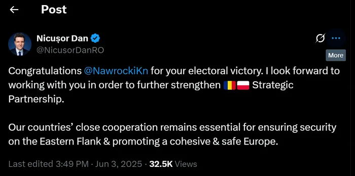 „Felicitări Karol Nawrocki pentru victoria ta electorală. Aştept cu nerăbdare să colaborăm, pentru a întări şi mai mult Parteneriatul Strategic dintre România şi Polonia. Colaborarea strânsă dintre ţările noastre rămâne esenţială pentru asigurarea securităţii pe Flancul Estic şi promovarea unei coeziuni şi siguranţe”, a scris Nicuşor Dan în mesajul postat pe X.