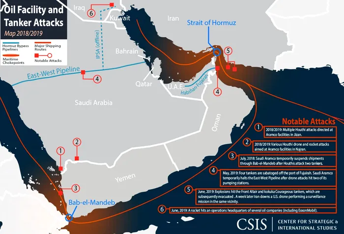 UKMTO a raportat „mai multe incidente de securitate” în Golful Arabiei și Golful Oman și a recomandat navelor să „transiteze cu prudență”. Potrivit platformei Kpler, cel puțin 150 de petroliere au rămas ancorate în apele Golfului, evitând Strâmtoarea Hormuz.